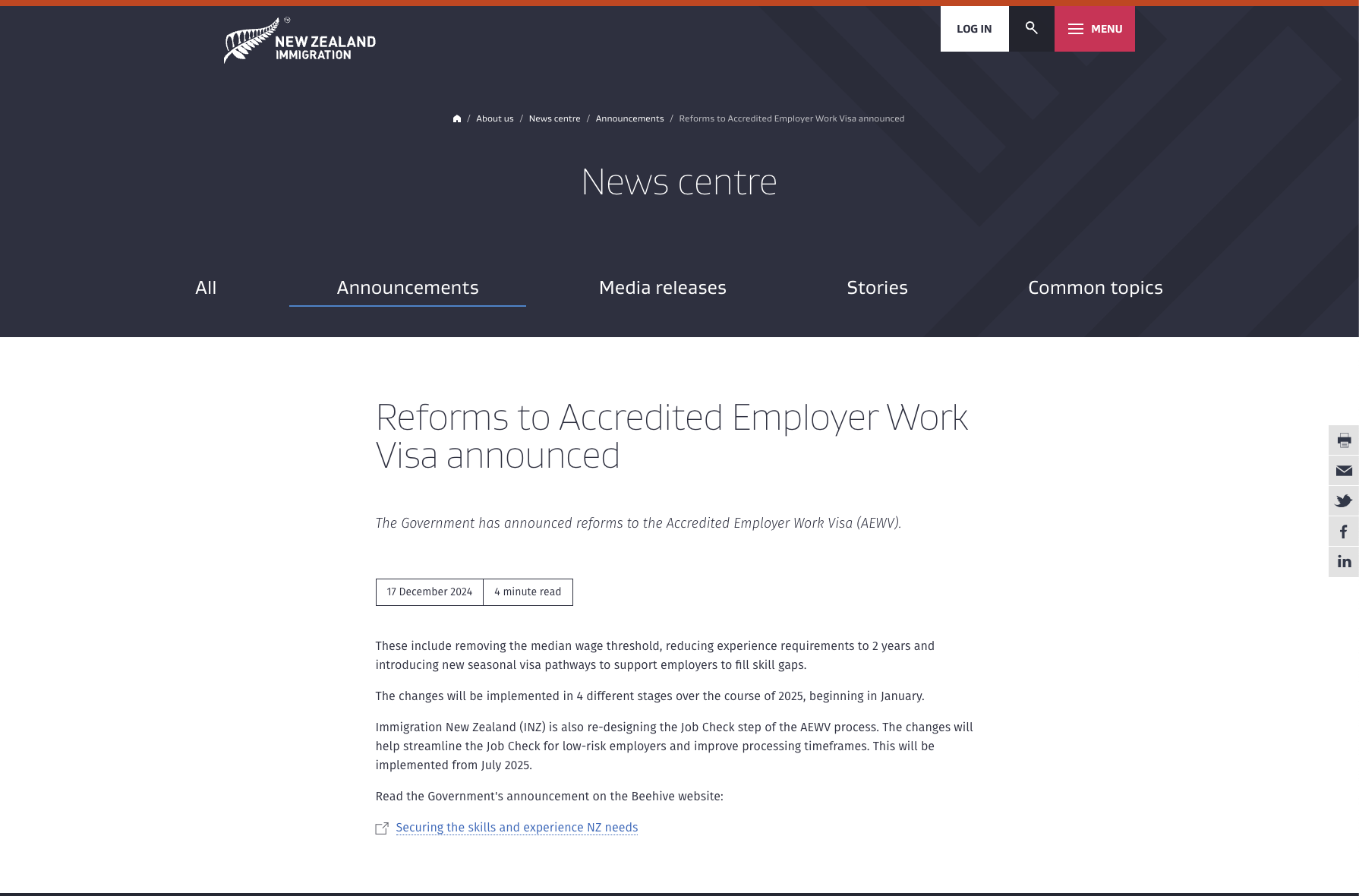 紐西蘭政府宣布,將於2025年3月10日起對「認證雇主工作簽證」(Accredited Employer Work Visa,簡稱 AEWV)進行一系列重大改革,重點包括取消中位數薪資要求、降低申請者的工作經驗門檻,並延長低技能職位的簽證期限。這些調整旨在協助雇主更靈活地應對不同產業和地區的勞動力需求,同時吸引更多技術人才來紐西蘭就業。